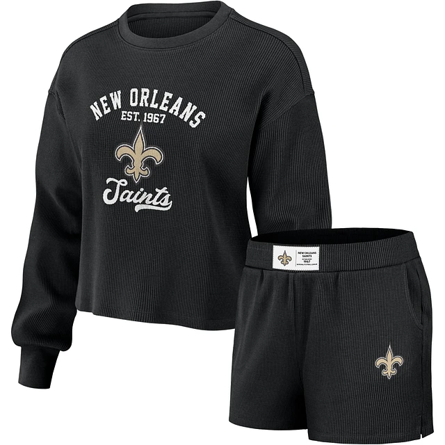 Women's WEAR by Erin Andrews Black New Orleans Saints Waffle Knit Long Sleeve T-Shirt & Shorts Lounge Set