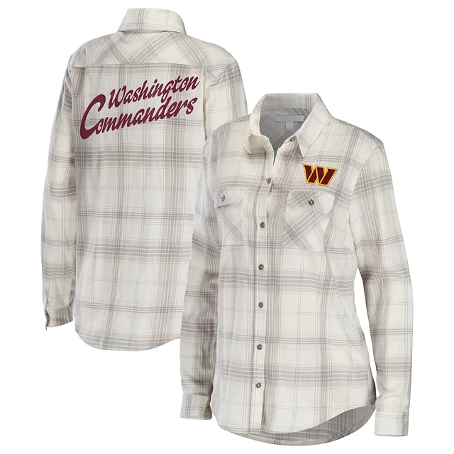 Women's WEAR by Erin Andrews Cream/Gray Washington Commanders Plaid Flannel Tri-Blend Long Sleeve Button-Up Shirt