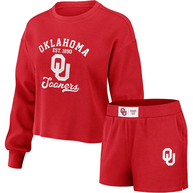 Women's WEAR by Erin Andrews Crimson Oklahoma Sooners Waffle Knit Long Sleeve T-Shirt & Shorts Lounge Set