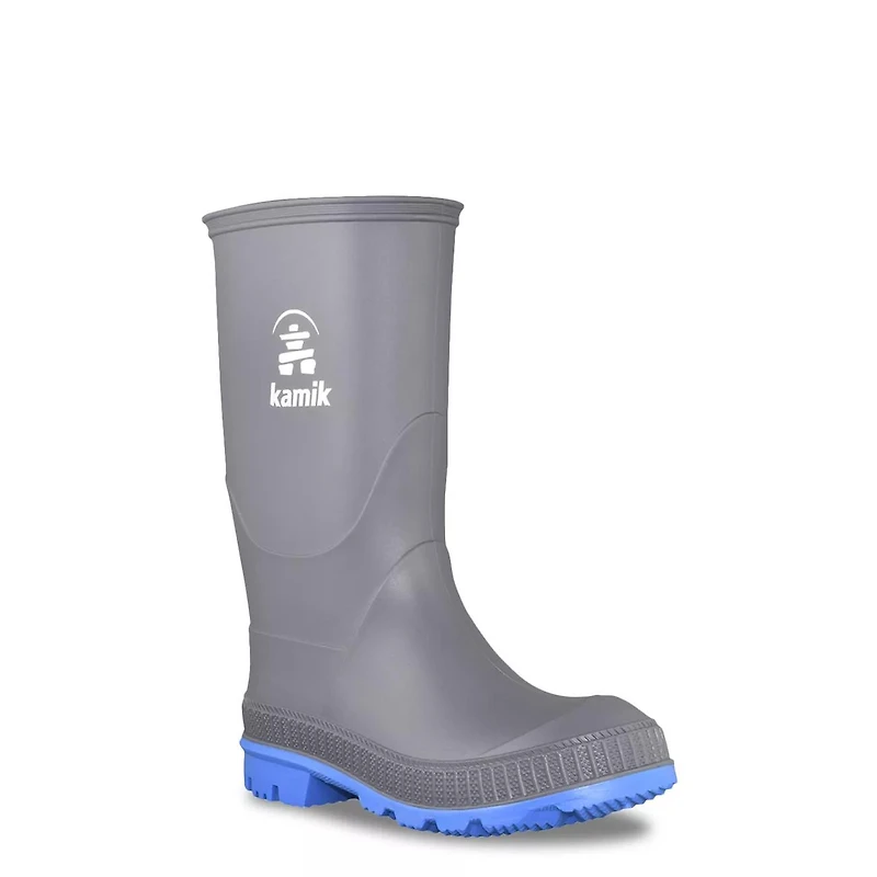 Help him gear up for rainy day adventures with these youth boy's Kamik grey/blue Stomp rubber rain boots. Featuring a seam-sealed waterproof construction, these Canadian made rain boots have a pull on design, a removable insole, a shock-absorbing midsole and a non-marking rubber outsole. Proudly made in Canada.