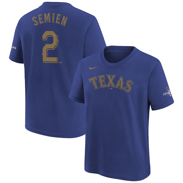 Youth Nike Marcus Semien Blue Texas Rangers 2024 Gold Collection Name & Number T-Shirt