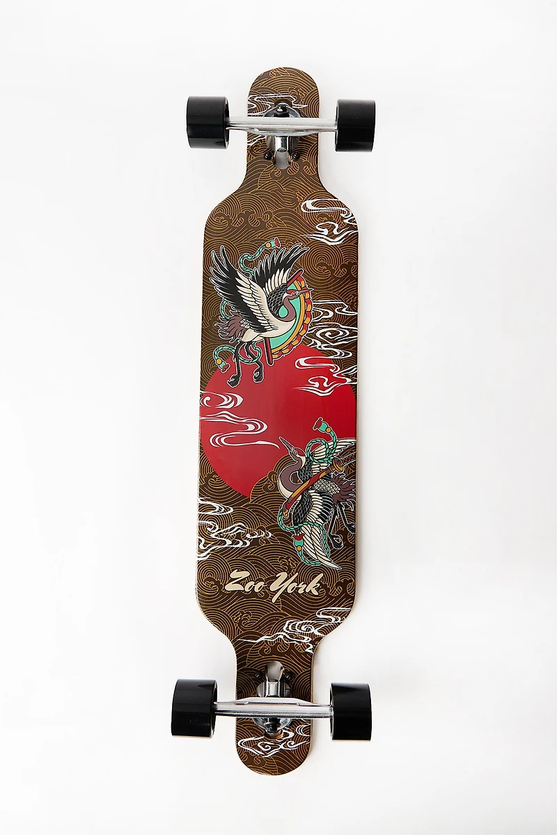 Pre-assembled and ready to rideLength: 40"Wheels: 70mm diameter for smooth cruising and stable ridesHardness: 78a durometer for a soft, grippy feel ideal for absorbing bumps and carvingSilver trucksBlack wheelsType: Drop-throughZoo York sunset cranes printSuitable for all skill levelsImported by Zoo YorkStyle #4651-190