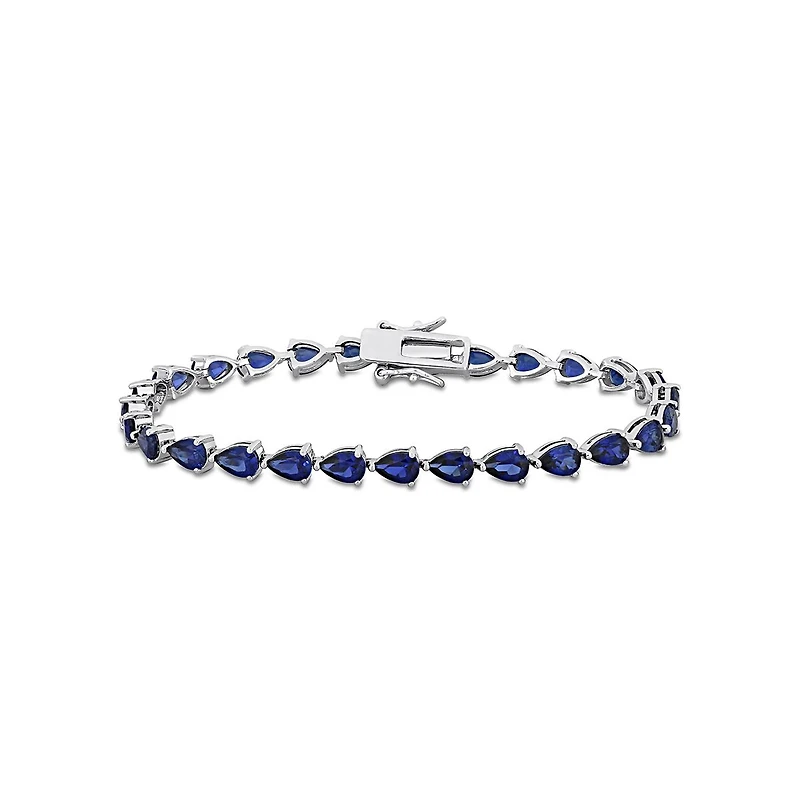 Be at your minimal best with this gorgeous pear tennis bracelet. This glittering bracelet is crafted in lustrous sterling silver and features twenty-seven pear-cut created blue sapphire gemstones in a tennis pattern for a charming look. Polished to a brilliant shine, this bracelet measures 7.25-inches in length. This chic bracelet is a contemporary classic addition to your collection